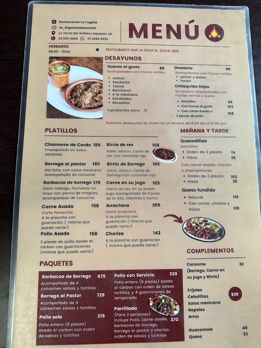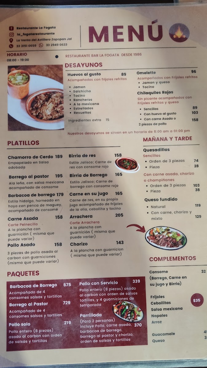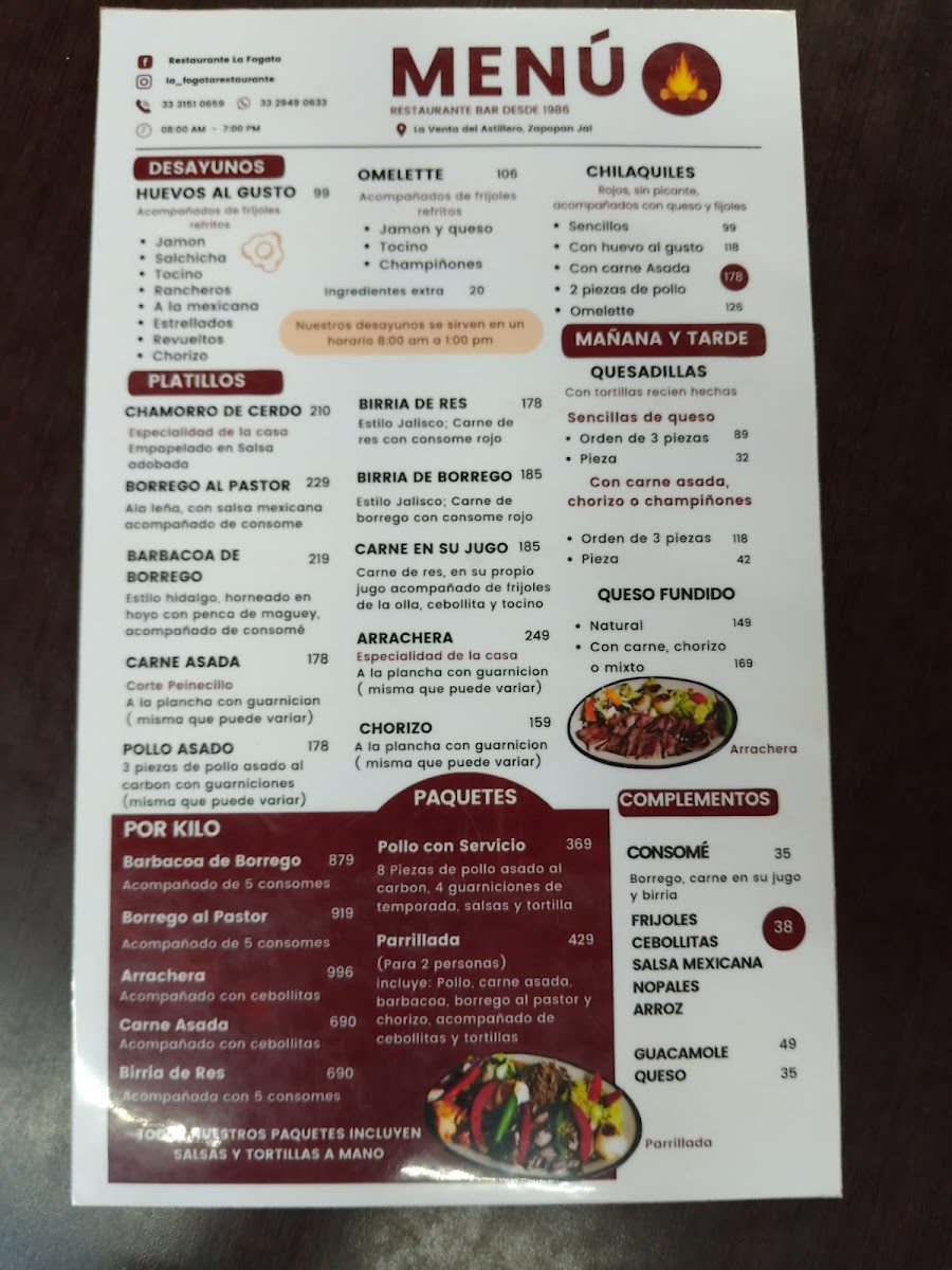 Restaurante La Fogata, nestled in Zapopan, Jalisco, offers an authentic taste of traditional Mexican cuisine. Known for its standout dishes like carne en su jugo and borrego birria, this eatery beautifully balances rich flavors with simple, fresh accompaniments. Guests often praise the generous taco fixings and the warm, friendly service, highlighted by attentive staff who engage warmly with visitors. The restaurant evokes nostalgic memories through its classic recipes, making it a beloved spot for both locals and visitors. Rapid service and genuine hospitality complete the experience, inviting diners to savor each bite in a welcoming, vibrant atmosphere.