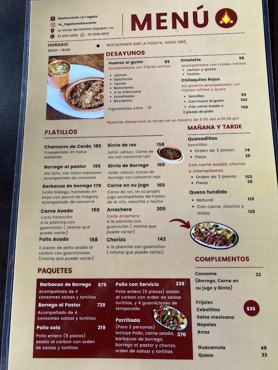 Restaurante La Fogata, located on Carretera a Nogales in Zapopan, Jalisco, Mexico, offers a genuine taste of traditional Mexican cuisine that deeply resonates with those seeking authentic flavors. The heart of their menu lies in specialties like the carne en su jugo and borrego birria, dishes that capture the rustic essence of local culinary heritage. The carne en su jugo impresses with its rich, savory broth and tender meat, delivering a comforting experience that feels like home. Meanwhile, the borrego birria, while rich in aroma and flavor, invites diners to craft their own tacos with a flavorful consommé and a variety of plentiful fixings, highlighting a customizable and interactive dining style.